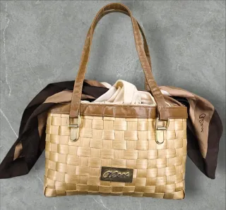Borsa a mano vintage in paglia intrecciata con dettagli in ecopelle. - Manici in ecopelle. - Chiusura con gancetti metallici. - Placca logo frontale. - Fodera interna in tessuto. - Foulard stampato che funge da chiusura .