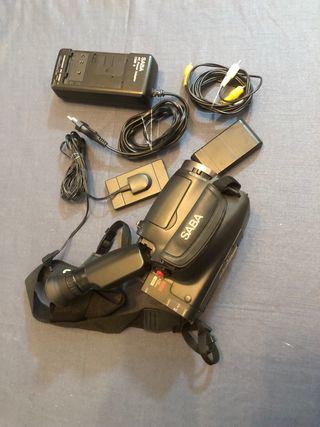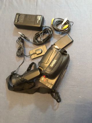 Videocamera analogica SABA di colore nero. - Alimentatore - Cavi di collegamento - Accessori vari