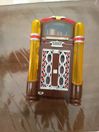 Mini jukebox Wurlitzer in stile retrò. - Design classico con finiture marroni e dettagli gialli. - Elementi decorativi che richiamano i jukebox tradizionali.