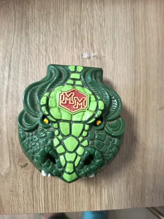 Un giocattolo Mighty Max a forma di testa di drago verde. Presenta dettagli intricati e un design accattivante. - Colore: Verde - Design: Testa di drago - Logo: MM su sfondo rosso