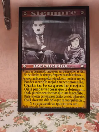 Poster motivazionale con immagini di Charlie Chaplin e una citazione ispiratrice. - Siempre Recuerda - Nunca es demasiado tarde para ser quién quieras ser... - Ojalá tu le saques lo mejor. - Y si encuentras que no es así, Ojalá tengas la fuerza para empezar de cero nuevamente.