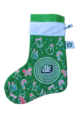 Calza vuota a tema natalizio con logo Tic Tac. Perfetta per un regalo o come decorazione. - Colore verde con stampe natalizie. - Logo Tic Tac centrale. - Tessuto resistente.