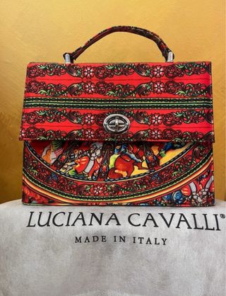 Borsa Marina Galanti con una stampa floreale vivace su sfondo nero. - Manici neri. - Tracolla regolabile. - Dettagli ricamati floreali.