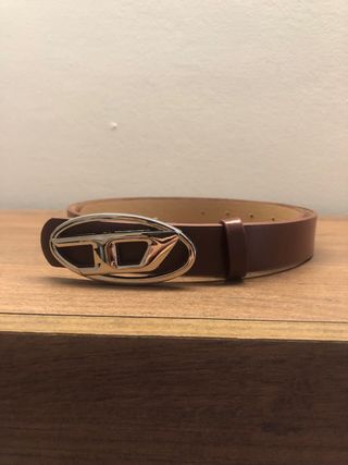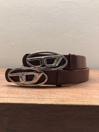 Cintura in pelle marrone con fibbia metallica a forma di logo. 105 x 2,5 cm unisex uomo donna - Design ovale della fibbia. - Marchio Diesel ben visibile.