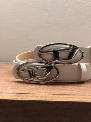 Cintura Diesel in pelle bianca con fibbia metallica. 105 x 2,5 centimetri unisex - Fibbia a forma di logo Diesel. - Dettagli in argento lucido.