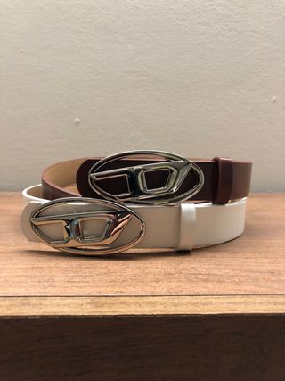 Set di due cinture Diesel, una marrone e una bianca, con fibbia a forma di D. Entrambe con misure di 2,5 cm per 105 cm sia per uomo che per donna - Fibbia in metallo argentato lucido. - Design ovale della fibbia.
