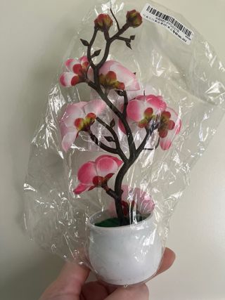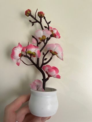 Pianta artificiale con vaso bianco, ideale per decorare qualsiasi ambiente. - Fiori rosa e boccioli. - Rami scuri. - Base verde.