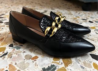 Eleganti mocassini da donna con un tocco di stile. - Punta affilata. - Dettaglio catena color oro. - pelle con motivo geometrico.