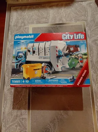 Gioco Playmobil City Life, cod 70885, camion snaltimento rifiuti. 51 pezzi. Età 4-10 anni. Include camion, bidoni e personaggi.