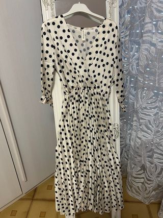 Elegante vestito lungo con stampa a pois. - Scollo a V. - Maniche a 3/4. - Gonna plissettata.