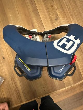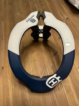 Neck brace Husqvarna by Leatt, ideale per la moto. - Colore blu e bianco. - Logo Husqvarna. - Scritta Pioneering Since 1903. - Chiusura regolabile.