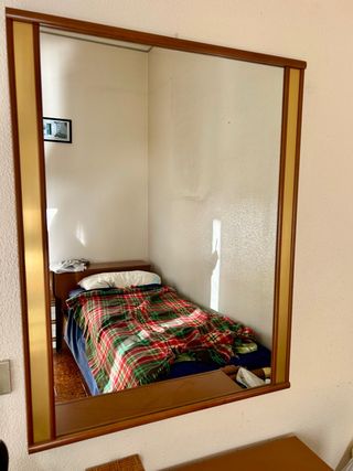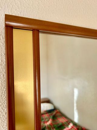 Vero pezzo di design dal gusto retrò, perfetto per dare luce e un tocco di classe a camera da letto, ingresso o zona living. Lo specchio è caratterizzato da una cornice robusta in legno pregiato con eleganti finiture laterali in oro satinato, che creano un contrasto materico raffinato e senza tempo. Lo specchio è in ottime condizioni estetiche, con vetro limpido e cornice ben conservata. Pronto per essere appeso (include già i supporti sul retro). Dettagli Tecnici: • Materiali: Legno massello e inserti in metallo dorato/ottone. • Stile: Vintage anni '70/'80 / Modernariato. • Dimensioni: 90-100 cm • Condizioni: Eccellenti