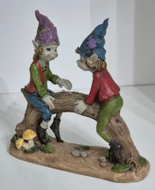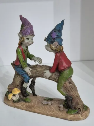 Deliziosa coppia di pixies seduti su un tronco che funge da ponte. Perfetti per aggiungere un tocco magico alla tua casa. - Dettagli finemente scolpiti. - Base decorata con funghi e sassolini. - Personaggi colorati con cappelli a punta. La testa di un folletto è stata accuratamente ricondizionata