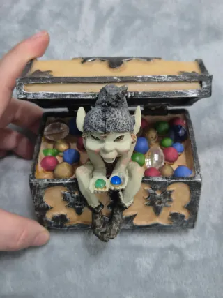Delizioso scrigno a forma di forziere con un simpatico pixie seduto sopra. Lo scrigno è riempito di sfere colorate che sembrano pietre preziose. - Dettagli in resina dipinta a mano. - Design fantasy unico. - Perfetto come soprammobile o portagioie.