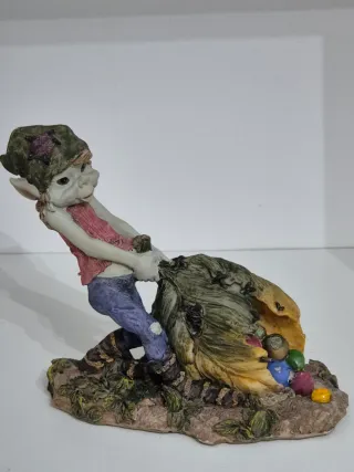 Delizioso pezzo decorativo raffigurante un pixie con un sacco pieno di pietre colorate. - Dettagli curati e colorati. - Base decorata con elementi naturali.