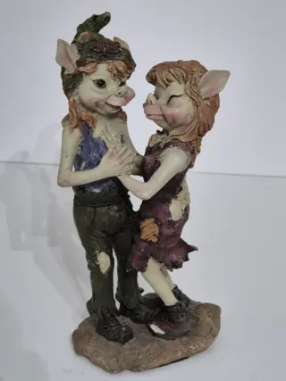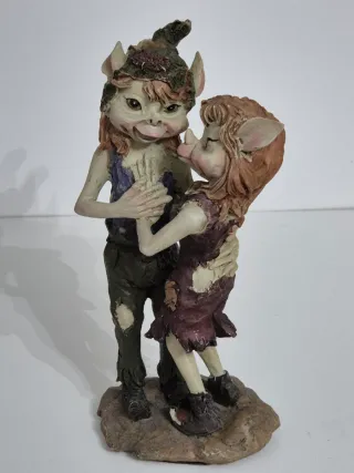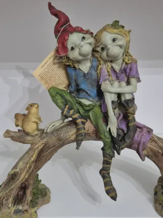 Bellissima statuetta raffigurante una coppia di pixies seduti su un tronco d'albero, accompagnati da uno scoiattolo. - Dettagli curati e colorazione vivace. - Perfetta per gli amanti del fantasy e delle creature magiche. - Realizzata in resina di alta qualità.