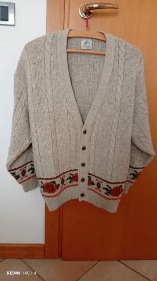 Caldo cardigan in lana, perfetto per le giornate più fredde. Presenta un bellissimo bordo decorato con rose rosse e dettagli floreali. Veste largo taglia 40/42. - Motivo a trecce sulle maniche e sul davanti. - Chiusura con bottoni. - Bordo inferiore con disegno floreale e rose rosse.