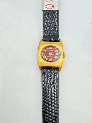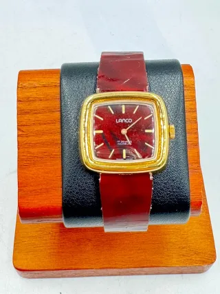 Marca: Lanco (Langendorf Watch Co.), storico brand svizzero d'eccellenza. Modello: Incabloc (indica la presenza di un sistema di protezione dagli urti per il bilanciere). Referenza: 1100 (incisa sul fondello). Movimento: Meccanico a carica manuale. Cassa: Placcata oro con finitura satinata; fondello in acciaio inossidabile (Stainless Steel Back). Quadrante: Rosso bordeaux con numeri romani dorati e logo Lanco a ore 12. Cinturino: Originale marchiato Lanco in pelle nera con stampa effetto rettile/lucertola.