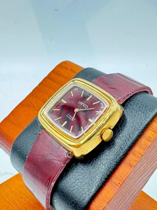 Modello: Dress Watch Vintage (anni '70). Movimento: Meccanico a carica manuale (17 Rubis). Cassa: Placcata oro, forma "TV Screen" con corona cabochon nera. Quadrante: Rosso lacca, stile minimalista senza indici. Cinturino: Pelle nera stampa lucertola