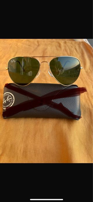 Occhiali da sole Ray-Ban modello Aviator. - Montatura color oro. - Lenti verdi. - Custodia originale inclusa. SENZA CUSTODIA