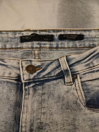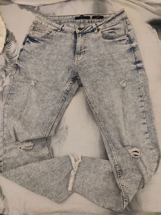 Jeans alla moda con un lavaggio effetto stone washed e dettagli strappati. - Vita media. - Chiusura con zip e bottone. - Tasche anteriori e posteriori. - Fondo gamba sfrangiato.