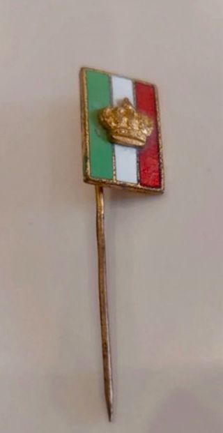 Spilla da giacca con la bandiera italiana e una corona dorata. - Design rettangolare. - Colori: verde, bianco, rosso. - Corona in rilievo.