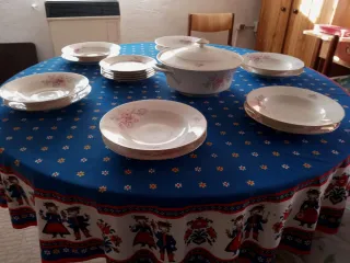 Tovaglia rotonda con un vivace motivo tirolese. Presenta un design a spicchi con fiori e figure tradizionali. - Motivo floreale su sfondo blu. - Bordi decorati con motivi geometrici e floreali. - Figure stilizzate di persone in abiti tradizionali. - Diametro cm.160