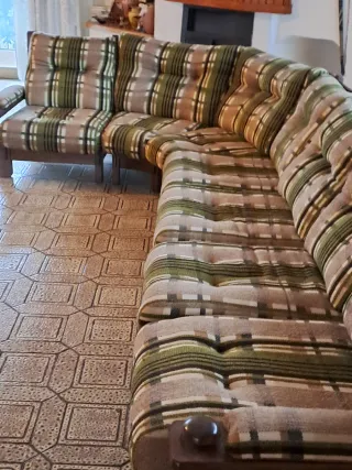 Comodo divano angolare, perfetto per la taverna o il soggiorno. La struttura è in legno massiccio, garantendo solidità e durata nel tempo. - Rivestimento in tessuto a quadri. - Design classico e accogliente.