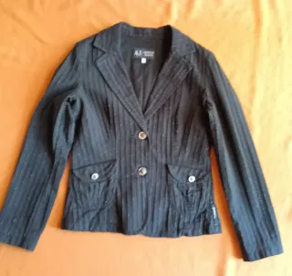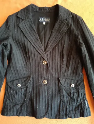 Elegante blazer da donna Armani Jeans. Fantasia a righe verticali. - Chiusura con due bottoni frontali. - Tasche frontali. - Dettagli metallici.