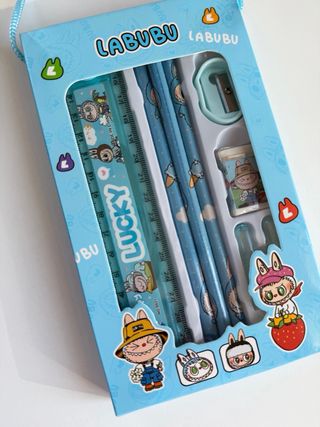 Set di cancelleria azzurro con simpatici disegni Labubu. - Include matite, temperino, righello e gomma. - Design colorato e divertente.