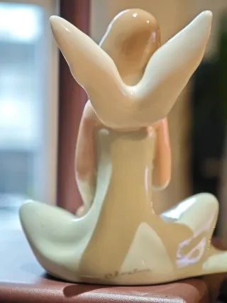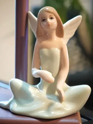 Deliziosa fatina realizzata in ceramica, con dettagli in rosa e bianco. Un'elegante decorazione. - Materiale: ceramica. - Colori: rosa,bianco e turchese