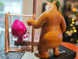 Set di giocattoli raffigurante Masha e Orso. - Orso marrone con dettagli chiari sul petto. - Masha con vestito rosa e cappuccio. - Masha è seduta su un'altalena bianca e marrone. Si regala, sperando di fare felice qualche bambino/a.