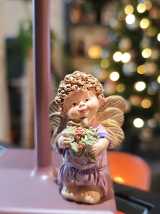Delizioso angioletto decorativo, perfetto per aggiungere un tocco magico alla tua casa. - Dettagli curati e finiture scintillanti. - Tiene tra le mani un mazzolino di fiori rossi e foglie verdi. - Ali dorate con glitter.