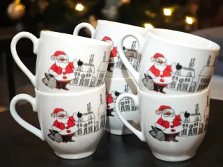 Set di 6 tazzine da caffè con un simpatico disegno di Babbo Natale e casette innevate. - Design natalizio. - Ideali per la colazione o il caffè. Una leggermente sbeccata, ma non è sul lato dove si appoggia la bocca.