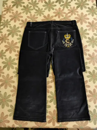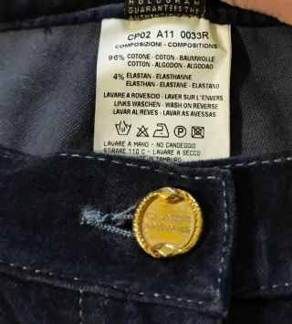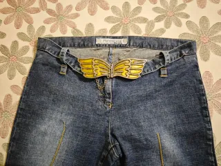 Jeans dal taglio classico con una particolare cintura metallica a forma di ali di farfalla. - Cintura con dettagli dorati e finitura anticata. - Chiusura a catenella con perno. Taglia 29