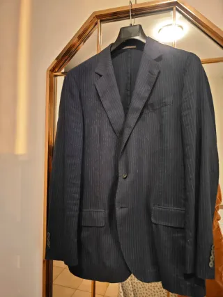 Elegante completo da uomo composto da tre pezzi, perfetto per occasioni formali. - Giacca monopetto a tre bottoni. - Pantaloni classici. - Tessuto con trama sottile. Segnalo macchioline sul lato dx della giacca e macchiolina sul pantalone, vengono via con lavatura
