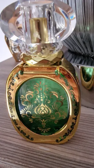 Elegante boccetta porta profumo con finiture dorate e dettagli in verde. - Design ricercato con decorazioni floreali. - Tappo trasparente e sfaccettato. - Base in metallo dorato.