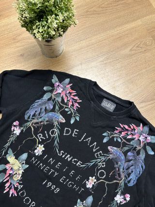 Felpa Down Up nera con grafica “Rio de Janeiro – Since 1998”. Stampa tropicale con dettagli floreali e camaleonti. Perfetta per look casual e street. 📏 Taglia S 📐 Lunghezza 67 cm – Manica 61 cm 🧵 Cotone Condizioni buone, leggermente usata con normali segni di usura. Spedizione disponibile 🚀