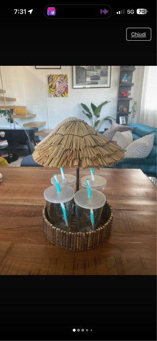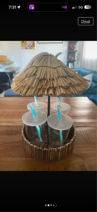 Set di quattro bicchieri con un originale design a forma di chiringuito, completi di cappello parasole. - Bicchieri trasparenti con cannucce azzurre. - Base decorativa in legno.