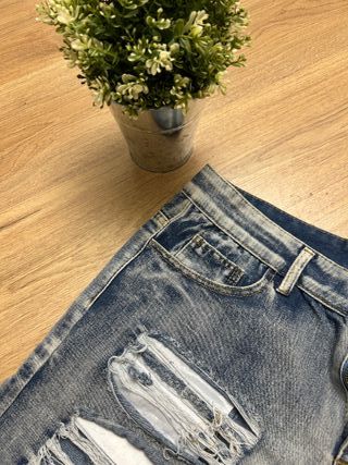 Bermuda jeans in denim blu con strappi frontali effetto distressed. Perfetti per outfit casual e street estivi. Fondo sfrangiato. 📏 Taglia 48 📐 Lunghezza 55 cm – Vita 96 cm – Coscia 50 cm 🧵 Denim cotone Condizioni ottime, praticamente nuovi, senza difetti. Spedizione disponibile 🚀