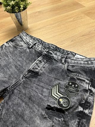 Jeans corti neri in denim con lavaggio vintage, strappi e dettagli applicati stile army. Perfetti per outfit casual e street estivi. 📏 Taglia 48 📐 Lunghezza 49 cm – Vita 98 cm – Coscia 52 cm 🧵 Cotone Condizioni buone, leggermente usati ma senza difetti. Spedizione disponibile 🚀