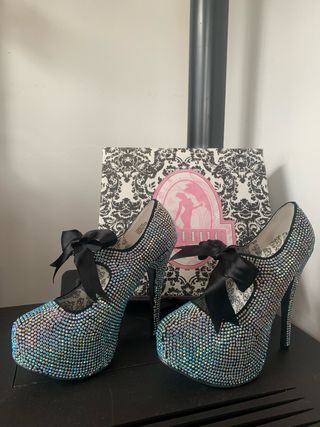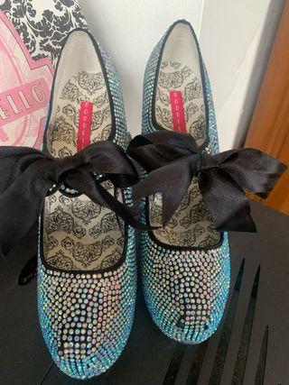 Eleganti scarpe con tacco alto, interamente ricoperte di strass scintillanti. Presentano un grazioso fiocco in raso nero sul collo del piede. - Dettagli in strass su tutta la tomaia. - Fiocco decorativo in raso nero. - Design Mary Jane con plateau. In ottime condizione, usate solo una volta. Com scatola originale e strass di ricambio.