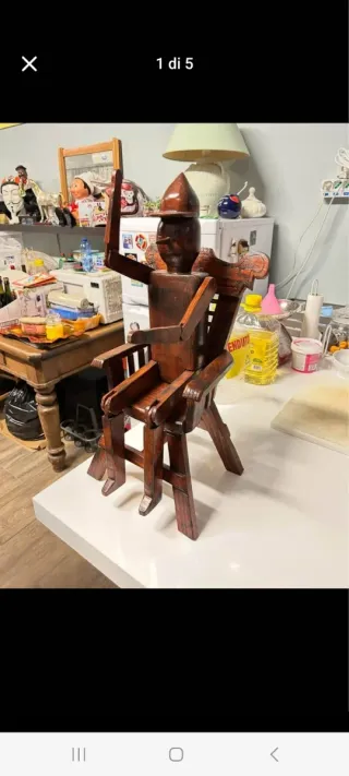 Personaggio di Pinocchio realizzato in legno 74 cm, seduto su una sedia. Possibile Ritiro a mano zona malpensa (mi)