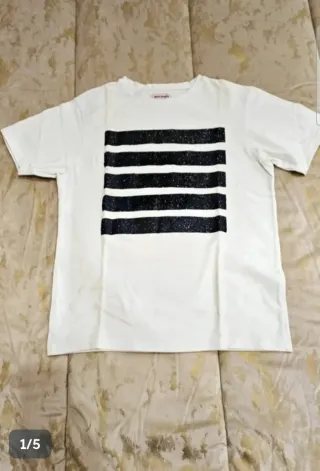 Maglietta a righe con un design casual e versatile. Perfetta per ogni occasione. - Maniche corte. - Girocollo. - Orlo con nodo laterale. Taglia M/IT 42/ EU 38 Marca New collection Usata qualche volta ma in buono stato, solo l'etichetta che non si legge molto, Tessuto 95% Viscosa e 5% Elastane