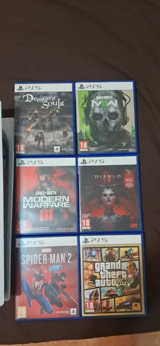 In vendita console PlayStation 5 in bianco con sei videogiochi. - Console PlayStation 5 - Mando DualSense - Demon's Souls - Call of Duty: Modern Warfare II - Call of Duty: Modern Warfare III - Diablo IV - Marvel's Spider-Man 2 - Grand Theft Auto V