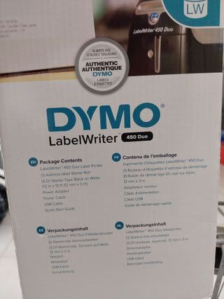 Stampante per etichette Dymo LabelWriter 450 Duo. - Include: stampante, rotolo di etichette per indirizzi, nastro D1 nero su bianco (12 mm x 3 m), alimentatore, cavo di alimentazione, cavo USB e guida rapida.