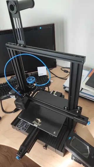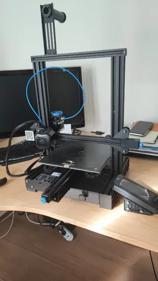 Stampante 3D Creality Ender 3 V2, un modello affidabile per la stampa. - Struttura in alluminio. - Piattaforma di stampa riscaldata. - Display integrato. Compresa di due bobine: - Nera da 1Kg Ender-PLA - Silver (ancora sigillata) Sunlu 1Kg Inoltre, comprende: - Ugelli di riserva - Blocco ugello di riserva Piatto un po' rovinato