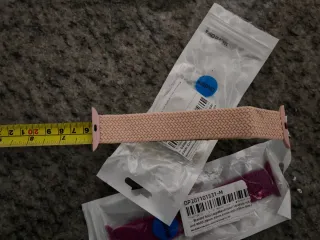 Set di tre cinturini in tessuto intrecciato per Apple Watch. - Colore: Rosa, Viola, Verde Foresta - Materiale: Tessuto intrecciato elastico - Compatibilità: 38mm, 40mm, 41mm, 42mm, 44mm, 45mm, 49mm