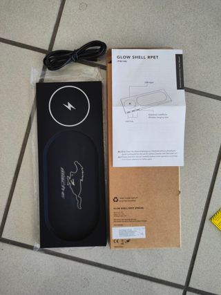 Stazione di ricarica wireless per smartphone Ford Mustang Mach-E da scrivania Ricarica senza fili per smartphone con scocca nera soft touch e logo (luminoso) Ford Mustang Mach-E Tre porte USB sul lato Prodotto nuovo e originale Ford codice CW 35030297 Realizzata in RPET riciclato.