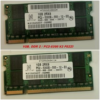 Ram 1GB. 2RX8 PC2-5300S-555-12-E0 Netlist DDR2 SDRAM x2 pezzi NL8126426107F-D53MSE Memory Type SODIMM Capacity 1GB Pins 200 Pin Bus Type PC-5300 Error Correction Non-ECC Cycle Time 6ns Cas CL5 Data Transfer Rate 667Mhz Memory Clock 166Mhz Voltage 1.8 ATTENZIONE PRIMA DI ACQUISTARE VERIFICARE CHE I CODICI SIANO GLI STESSI RIPORTATI NELLE DICITURE E NELLE FOTO. PRODOTTO USATO FUNZIONATE E TESTATO . ASSICURARSI DELLA COMPATIBILITA' DEL BIOS [rif. Ram30] x 2 pezzi